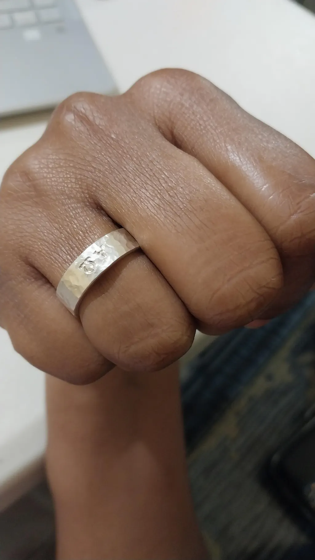 A rustic silver ring with a timeworn feel and ancient-style chiseled letters. Stamped with the Greek symbols Alpha and Omega—symbolizing God’s eternal nature.